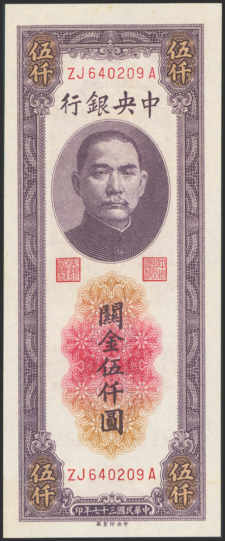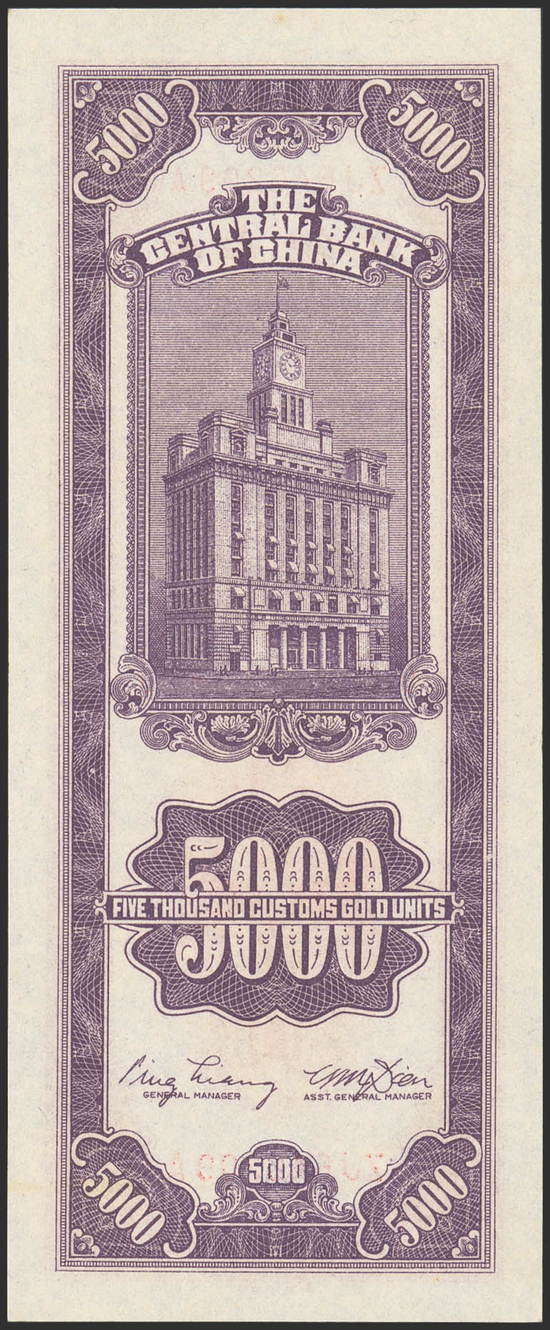 CHINA. 5000 Custom gold units. 1948. Central Bank of China. (Pick: 361). Almost Uncirculated.