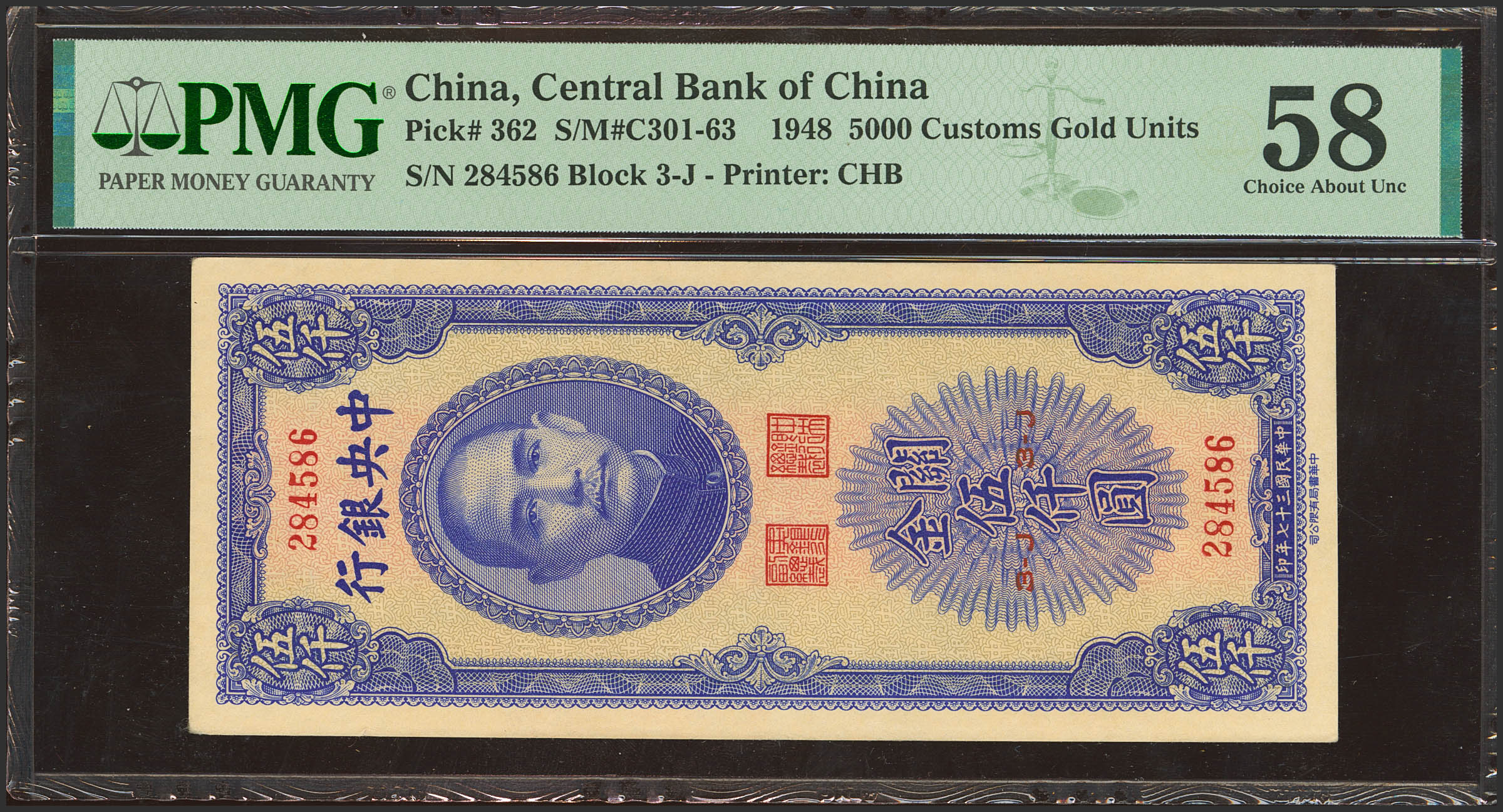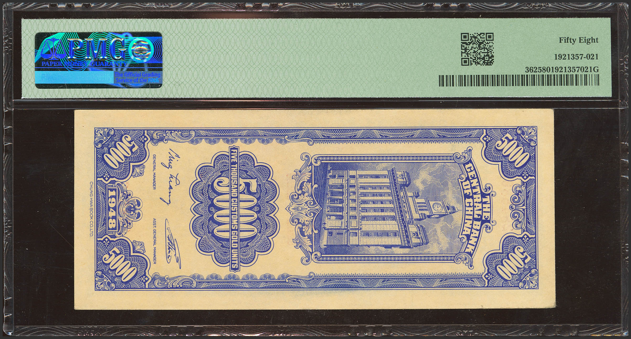 English CHINA. 5000 Custom gold units. 1948. Central Bank of China. (Pick: 362, SM: C301-63). PMG58.