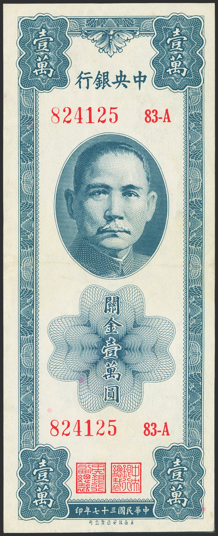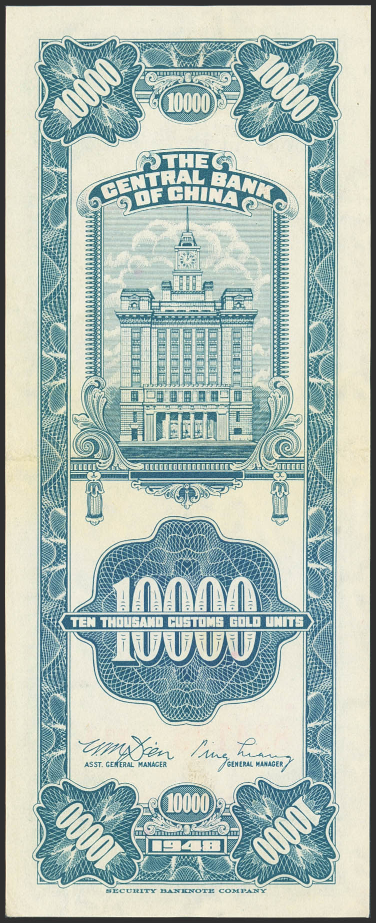CHINA. 10000 Custom gold units. 1948. Central Bank of China. (Pick: 363). Extremely Fine.
