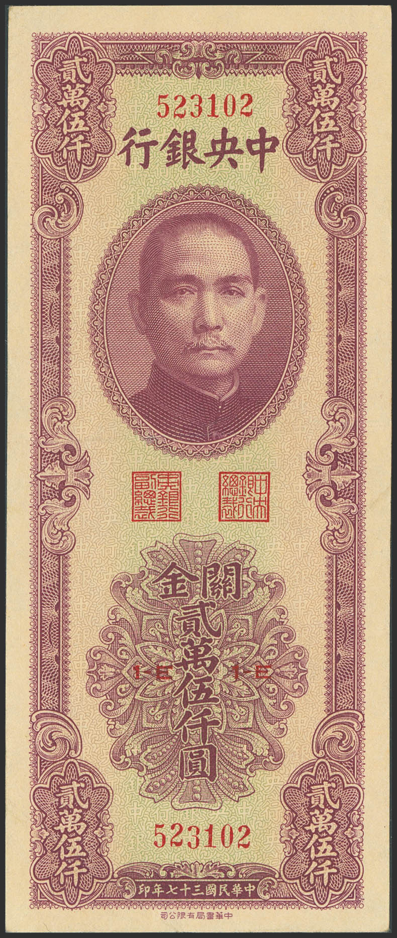 CHINA. 25000 Custom gold units. 1948. Central Bank of China. (Pick: 367). Almost Uncirculated.