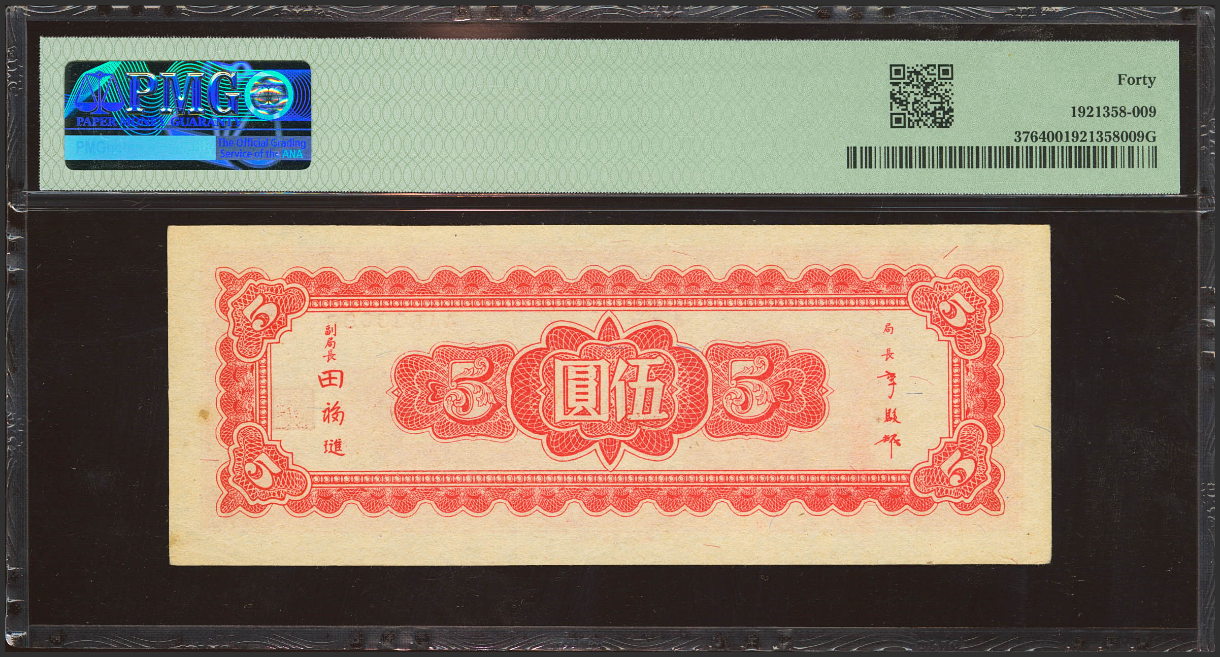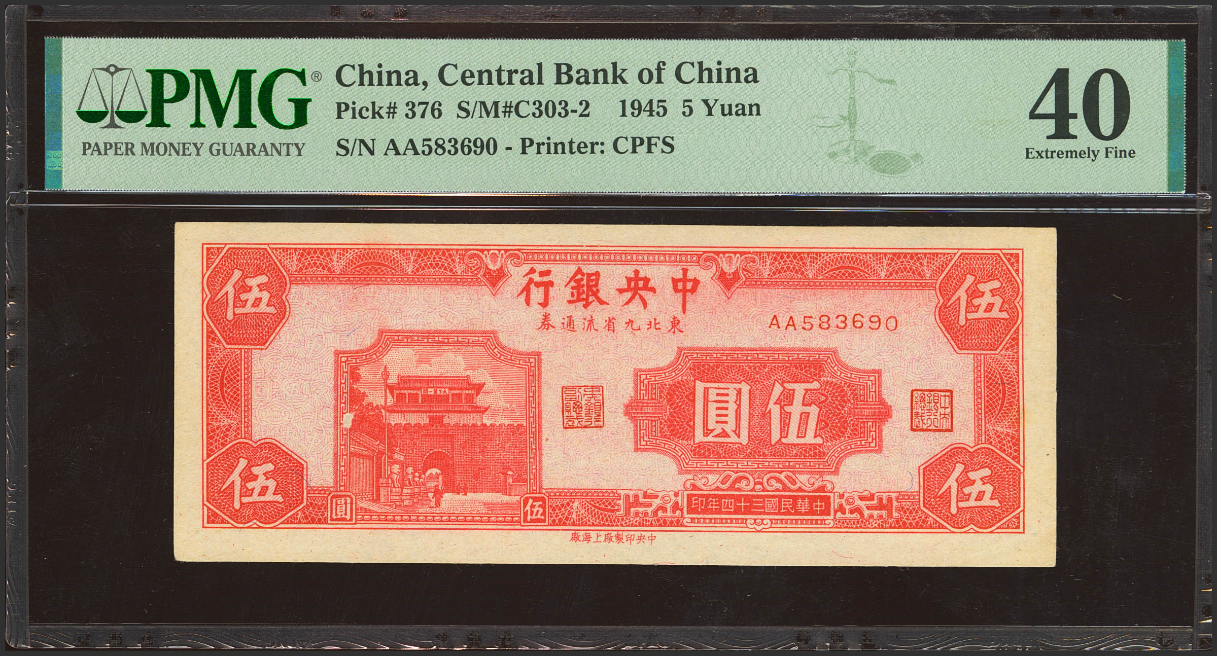 CHINA. 5 Yuan. 1945. Central Bank of China. Nine Northeastern Provinces. (Pick: 376, SM: C303-2). PMG40.