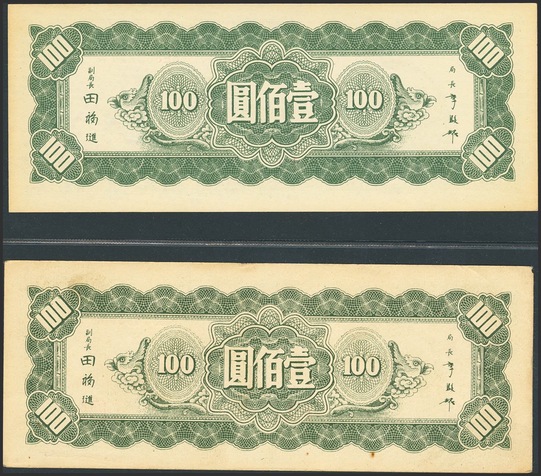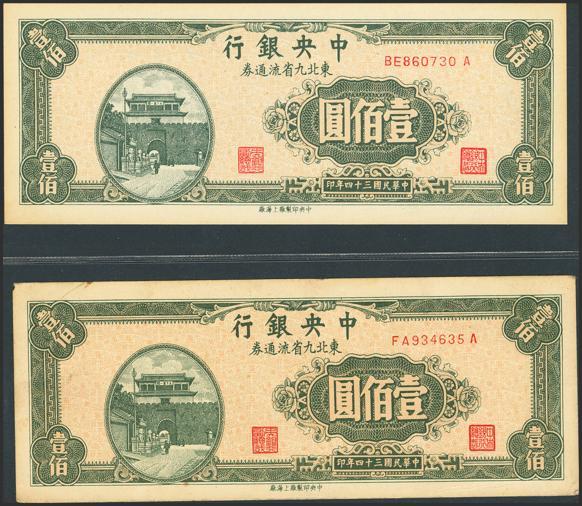 CHINA. Lot of 2 notes of 100 Yuan. 1945. Central Bank of China. Nine Northeastern Provinces. (Pick: 379). Less than Uncirculated and About Uncirculated.