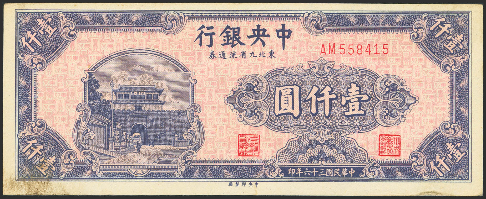 CHINA. 1000 Yuan. 1947. Central Bank of China. Nine Northeastern Provinces. 5 characters in the printer's name. (Pick: 382a). Almost Uncirculated.