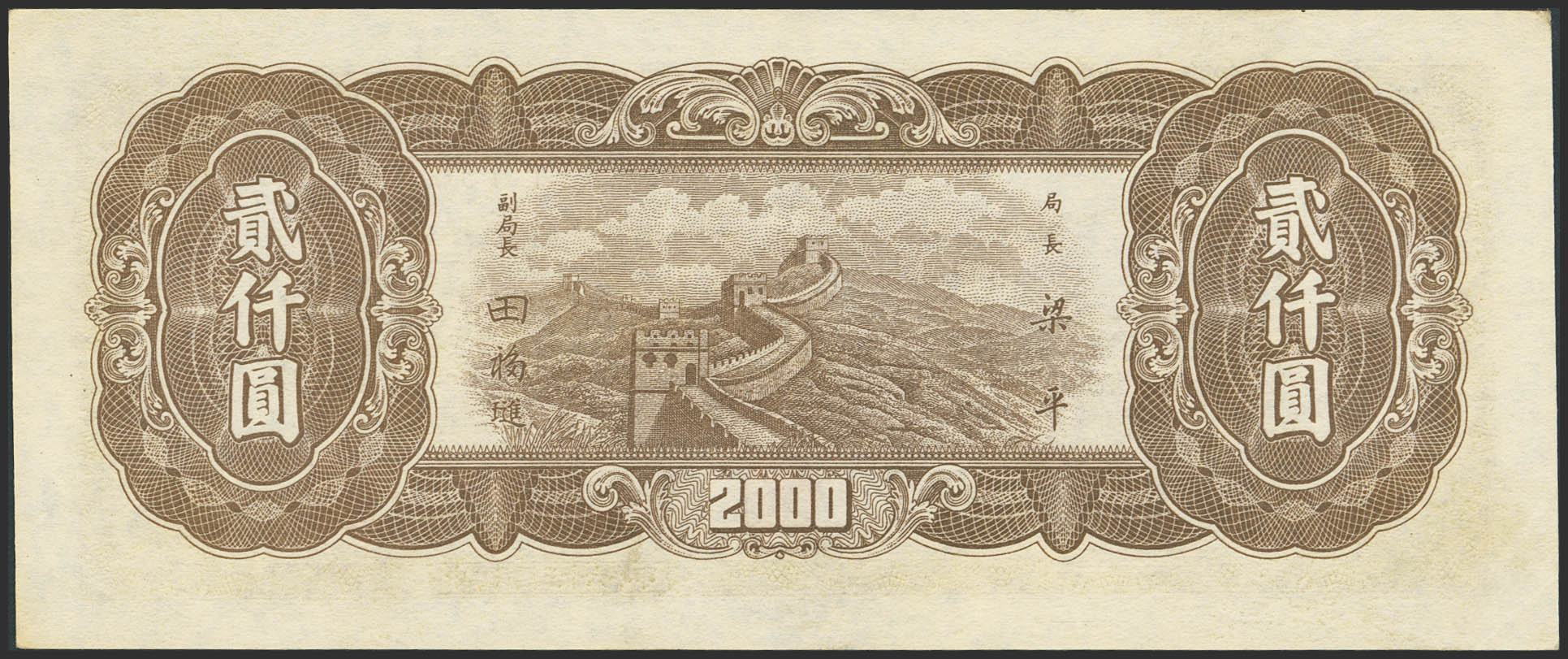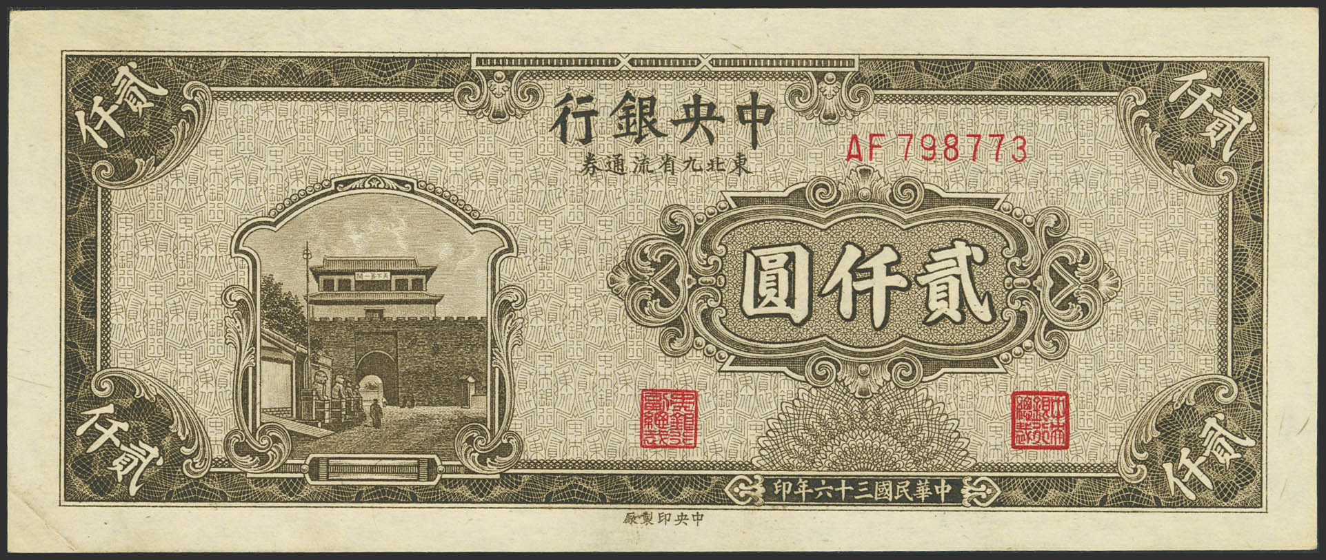 English CHINA. 2000 Yuan. 1947. Central Bank of China. Nine Northeastern Provinces. (Pick: 383). Less than Uncirculated.