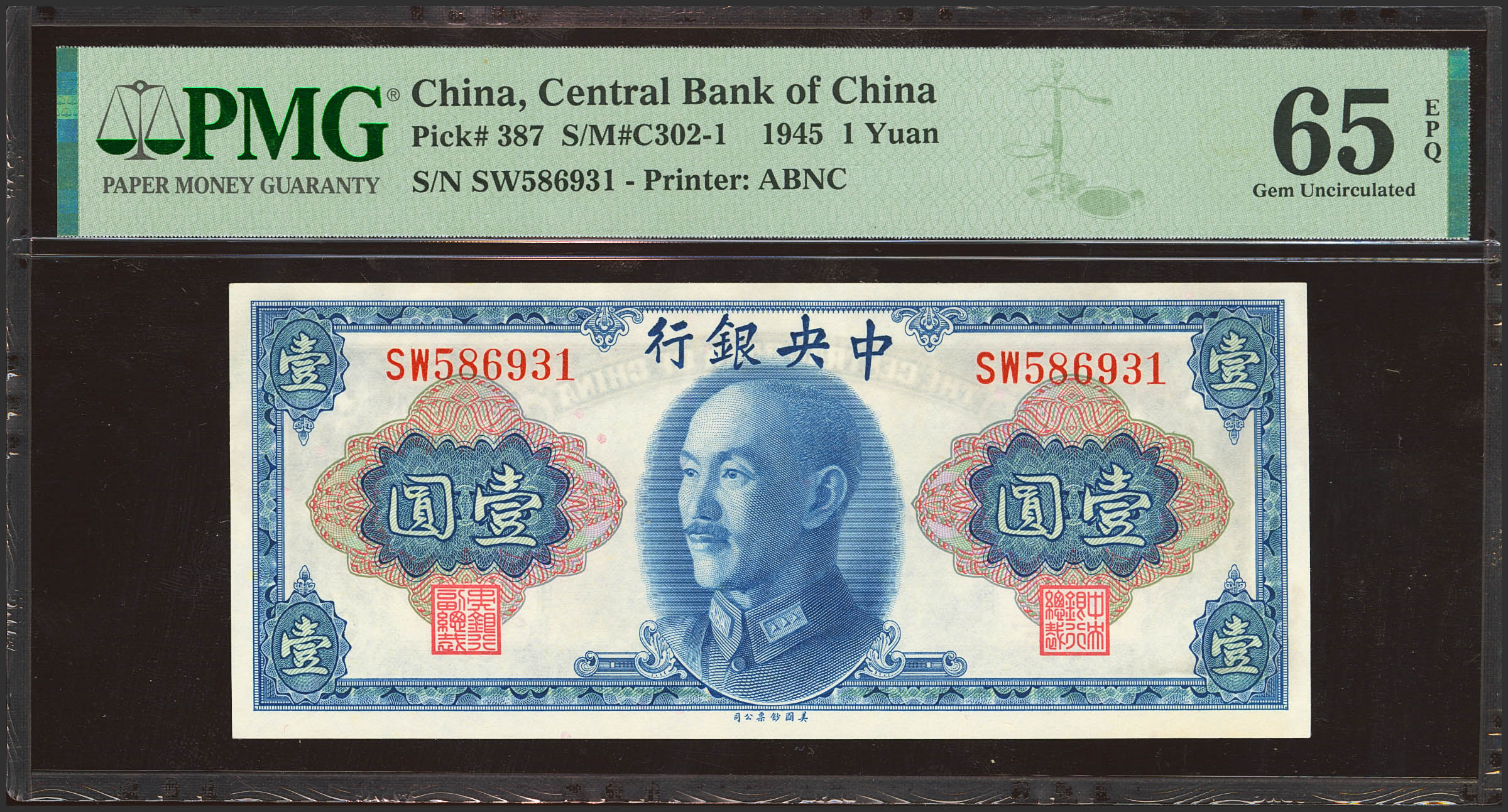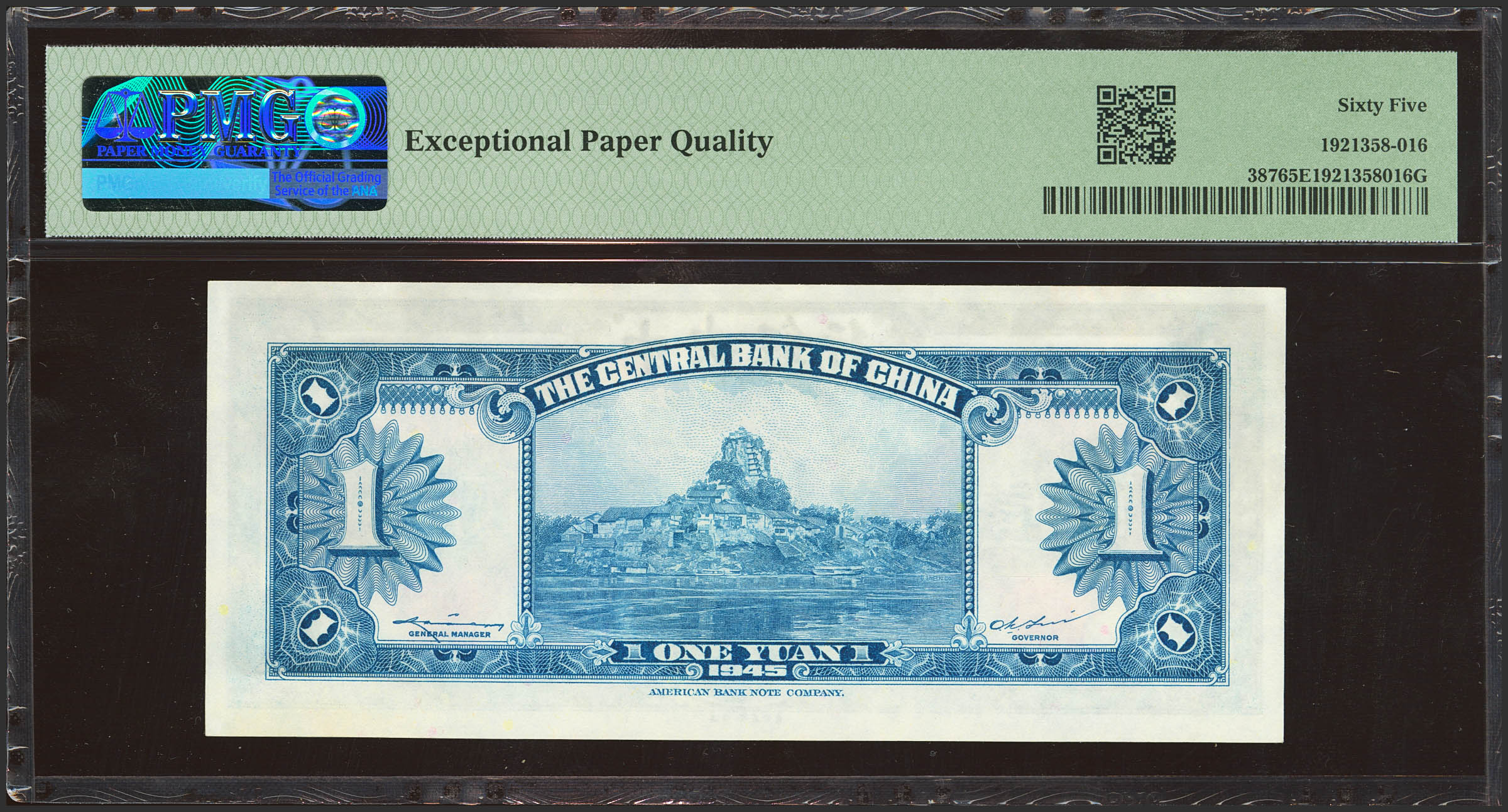 CHINA. 1 Yuan. 1945. Central Bank of China. (Pick: 387, SM: C302-1). PMG65EPQ.