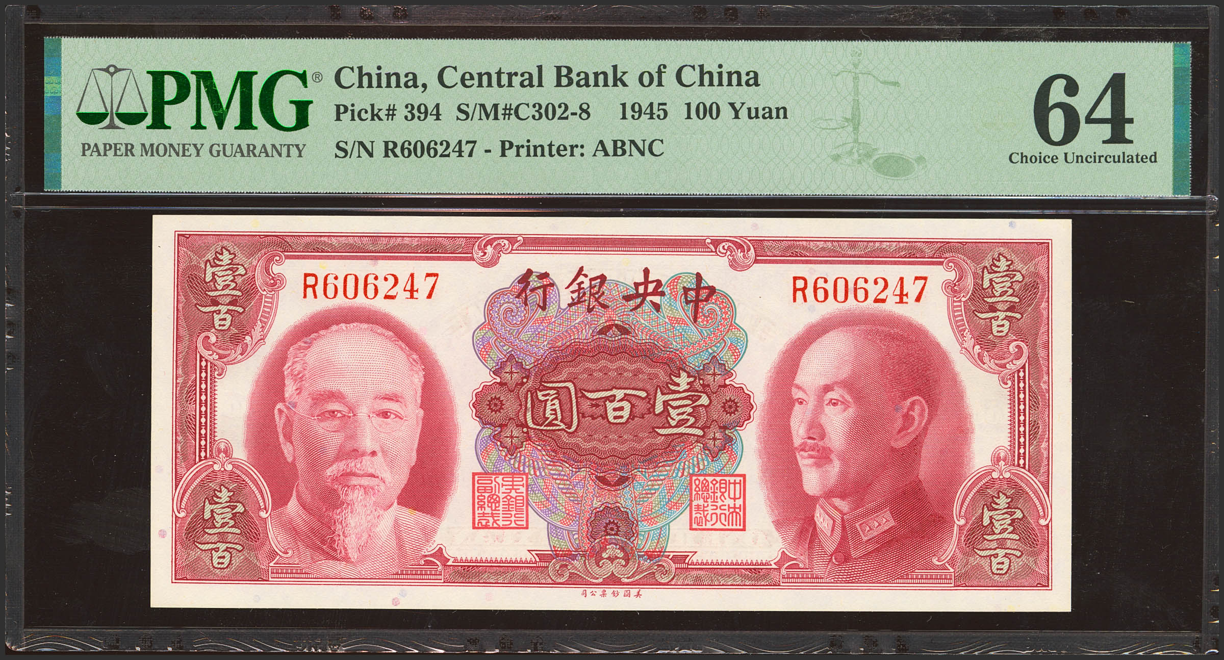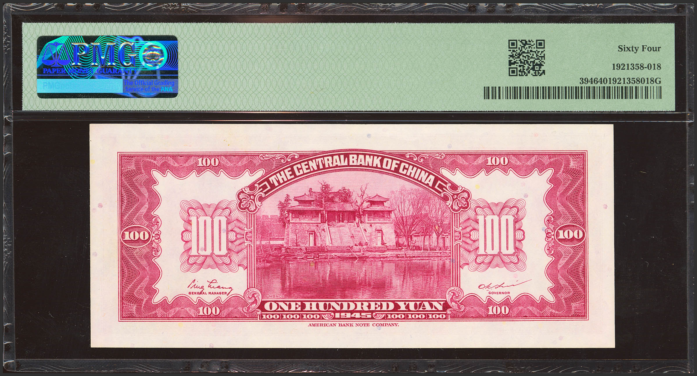 CHINA. 100 Yuan. 1945. Central Bank of China. (Pick: 394, SM: C302-8). PMG64.