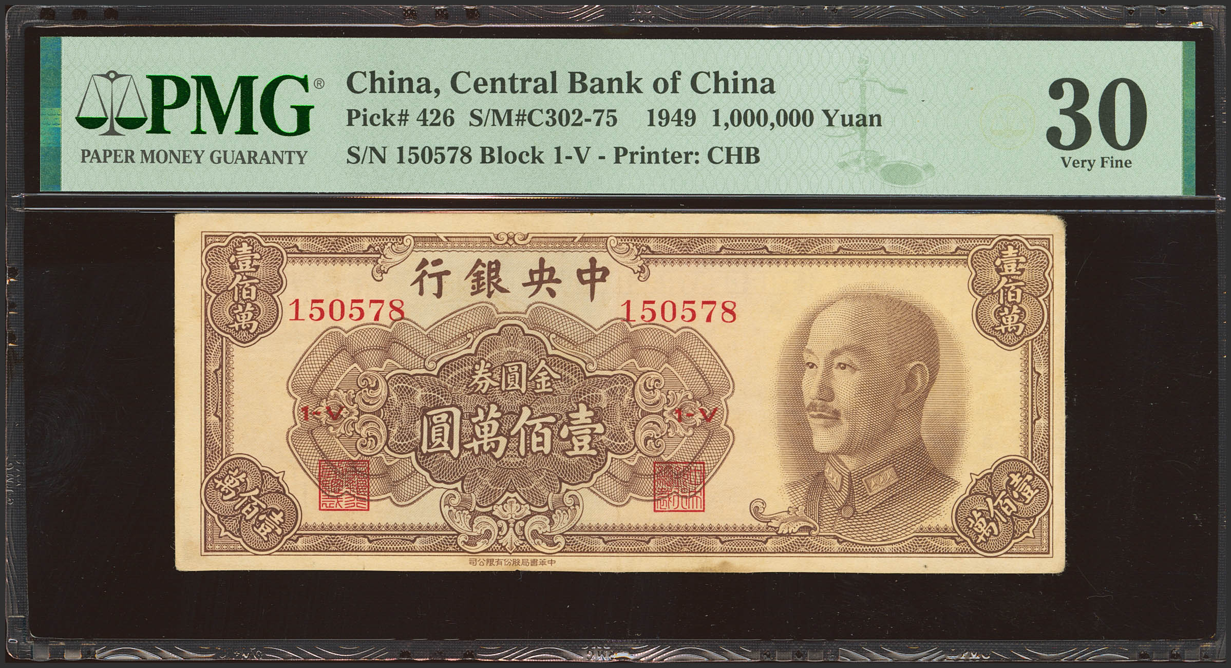 English CHINA. 1000000 Gold Yuan. 1949. Central Bank of China. (Pick: 426, SM: C302-75). PMG30 (minor stains).