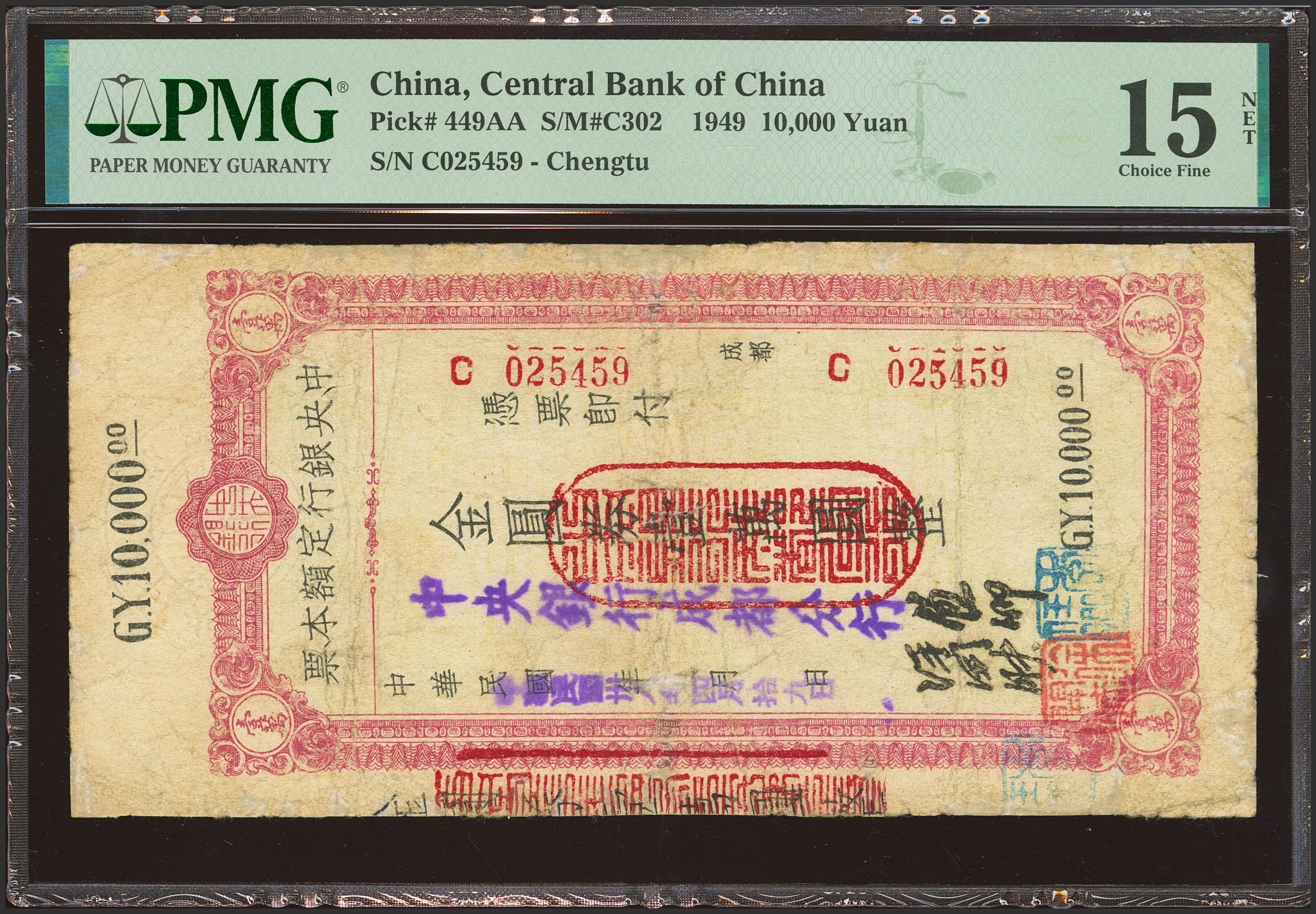 CHINA. 10000 Gold Yuan. 1949. Central Bank of China. Circulating Cashier's Check. Chengtu. (Pick: 449AA, SM: C302). Restored. PMG15NET (repaired).