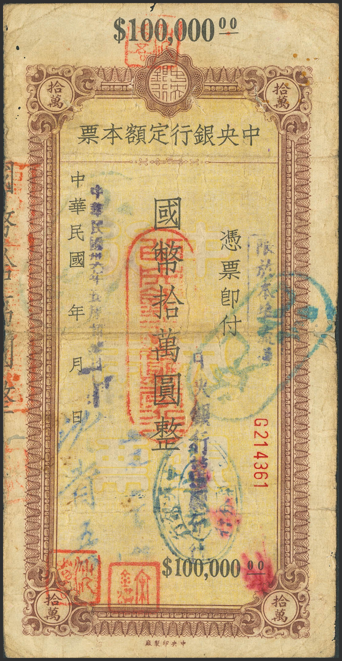 CHINA. 100000 Gold Yuan. 1948. Central Bank of China. Circulating Cashier's Check. ChangChung. (Pick: 449G). Tap added. Fine.