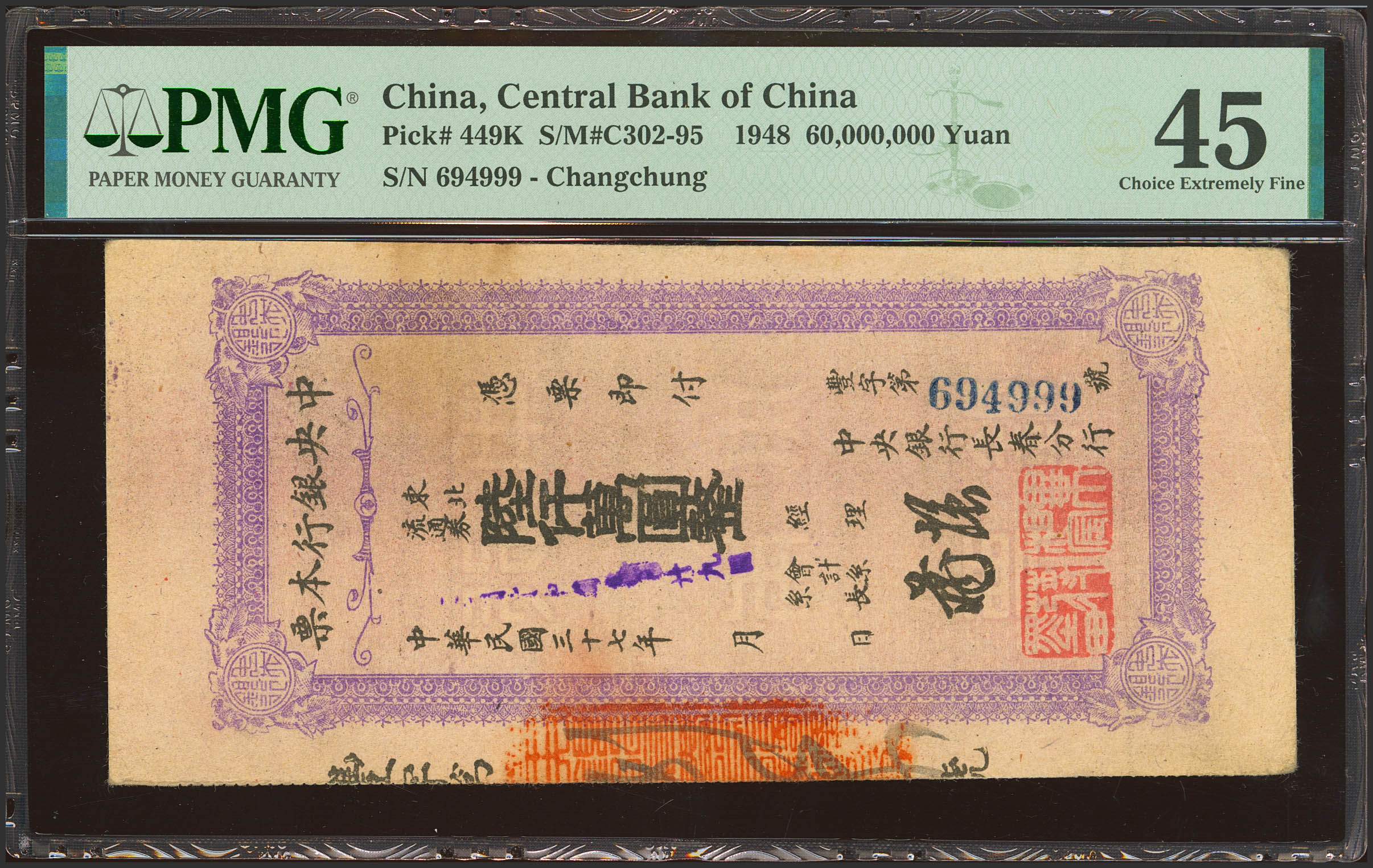 CHINA. 60000000 Gold Yuan. 1948. Central Bank of China. Circulating Cashier's Check. Changchung. (Pick: 449K, C302-95). PMG45.