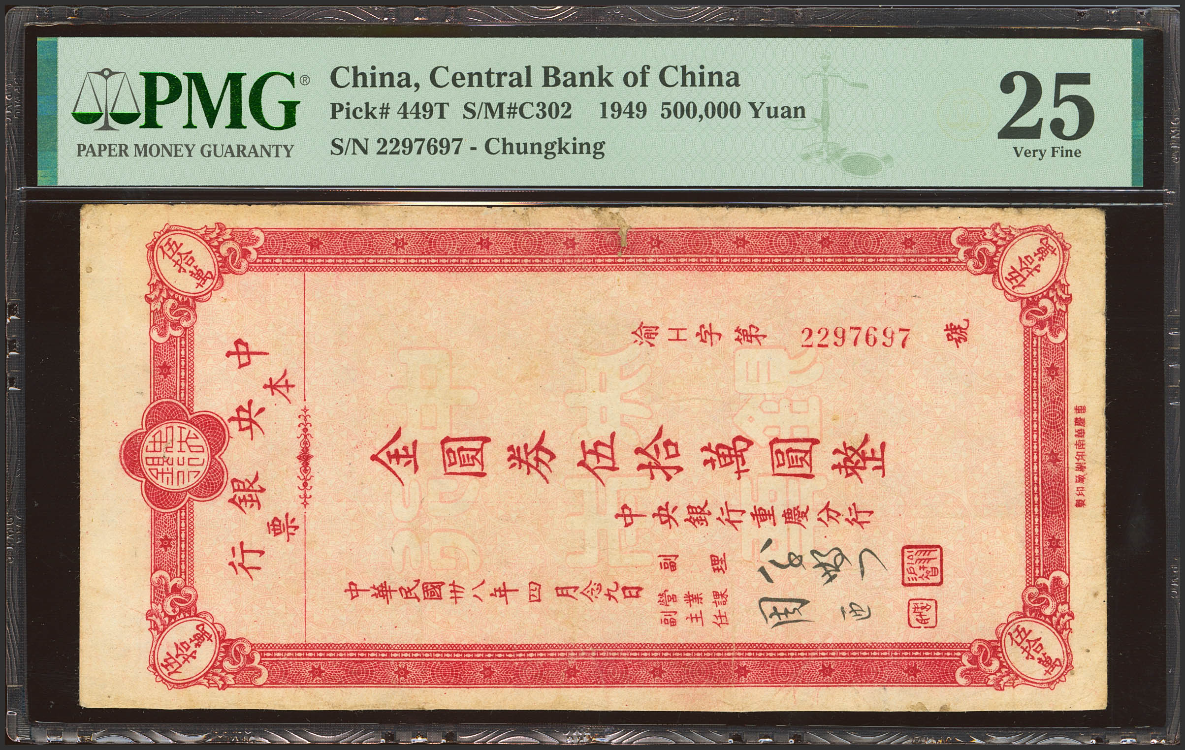 CHINA. 500000 Gold Yuan. 1948. Central Bank of China. Circulating Cashier's Check. Chungking. (Pick: 449T, SM: C302). PMG25 (minor repairs).