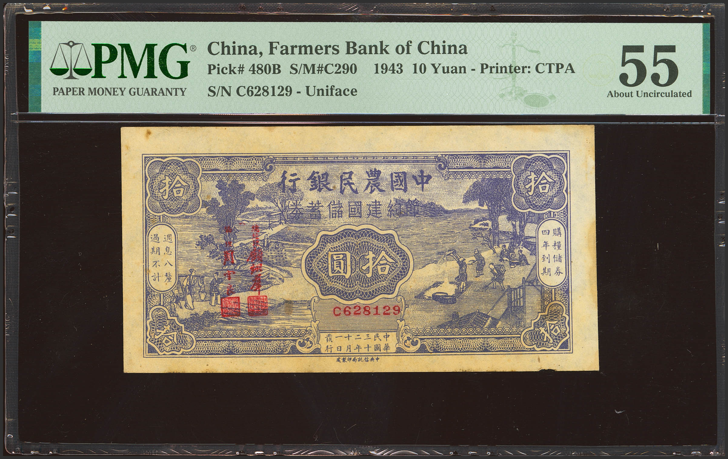 English CHINA. 10 Yuan. 1943. Farmers Bank of China. (Pick: 480B, SM: C290). PMG55 (stains).