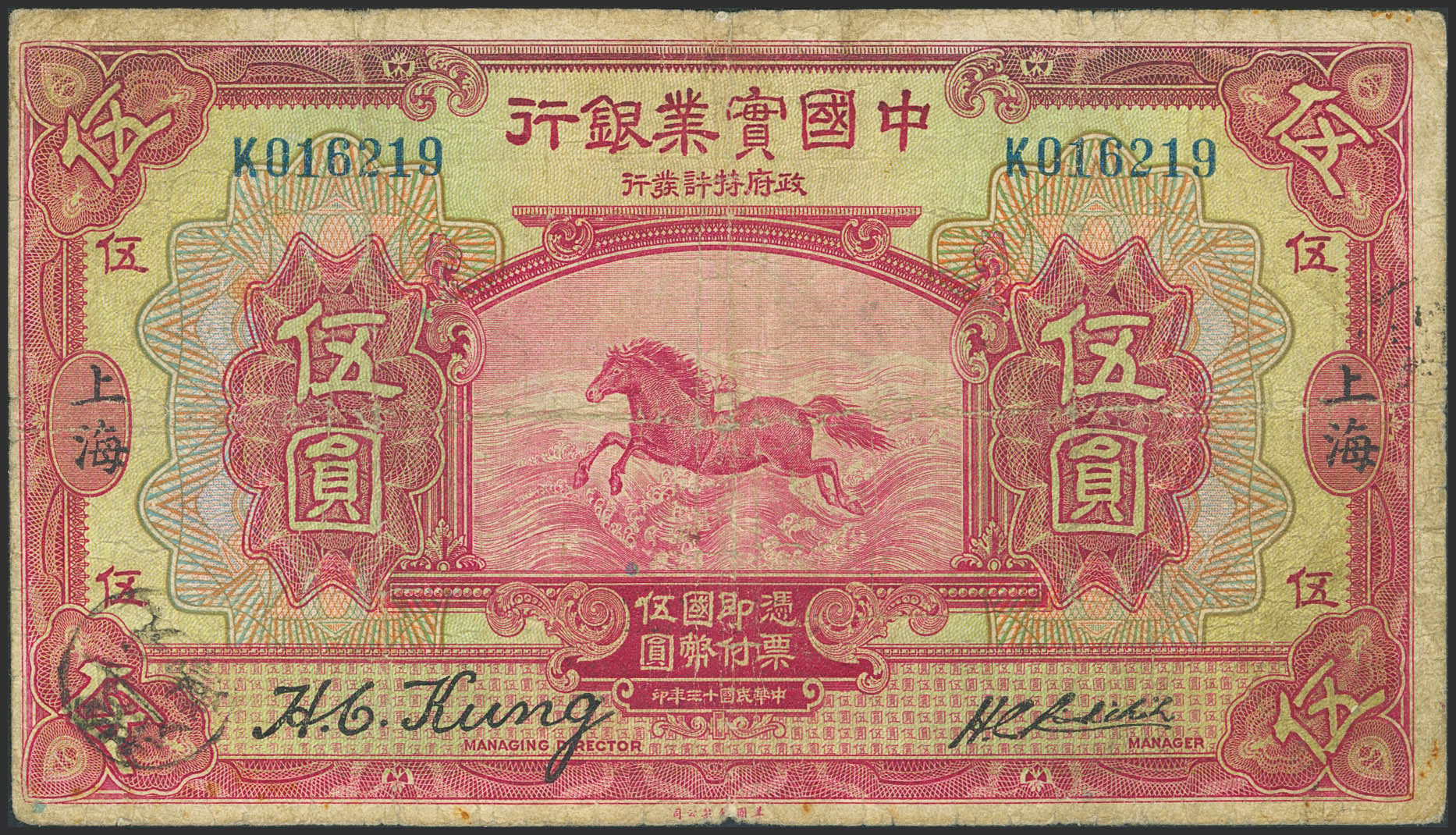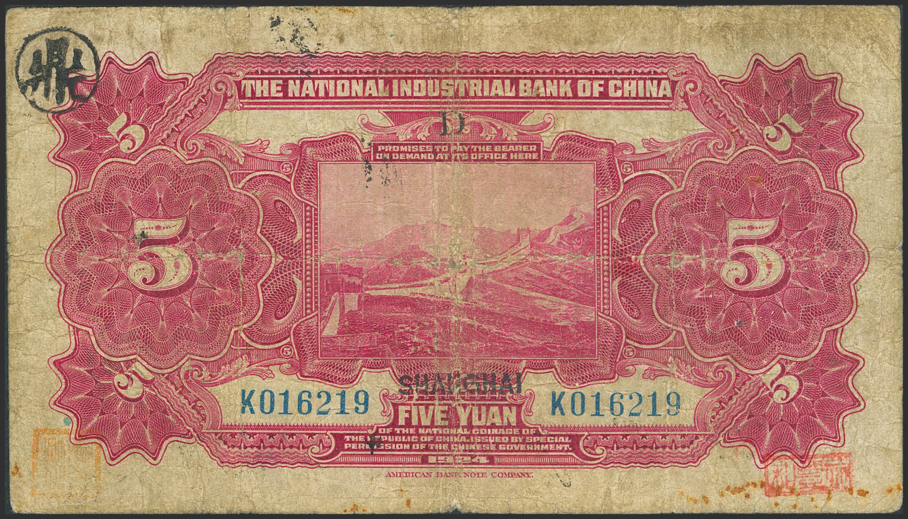 CHINA. 5 Yuan. 1924. National Industrial Bank of China. Shanghai. (Pick: 526b). Fine.