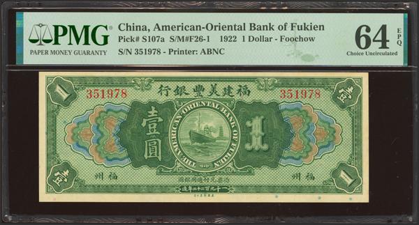 CHINA. 1 Silver Dollar. 16 September 1922. American-Oriental Bank of Fukien. Foochow. (Pick: S107, SM: F26-1). PMG64EPQ. Automatically generated translation