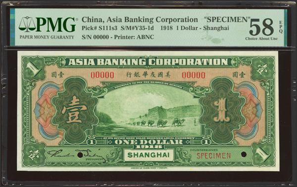 CHINA. 1 Dollar. 1918. Asia Banking Corporation. Shanghai. Specimen. (Pick: S111s3, SM: Y35-1d). PMG58EPQ. Automatically generated translation