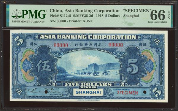 CHINA. 5 Dollars. 1918. Asia Banking Corporation. Shanghai. Specimen. (Pick: S112s, SM: Y35-2d). PMG66EPQ. Automatically generated translation