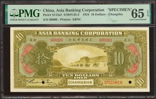 CHINA. 10 Dollars. 1918. Asia Banking Corporation. Changsha. Specimen. (Pick: S113s3, SM: Y35-3). PMG65EPQ. Automatically generated translation