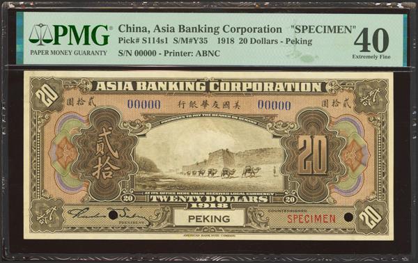 CHINA. 20 Dollars. 1918. Asia Banking Corporation. Beijing. Specimen. (Pick: S114s1, SM: Y35). PMG40. Automatically generated translation