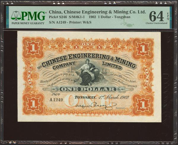CHINA. 1 Dollar. 1 March 1902. Chinese Engineering and Mining Company Limited. Tongshan. (Pick: S246, SM: K1-1). PMG64EPQ. Automatically generated translation