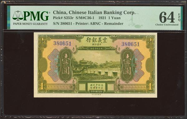 CHINA. 1 Yuan. 15 September 1921. Chinese Italian Banking Corporation. (Pick: S253, SM: C36-1). PMG64EPQ. Automatically generated translation