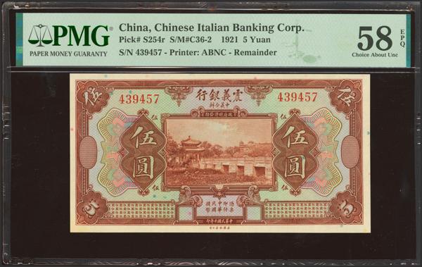 CHINA. 5 Yuan. 15 September 1921. Chinese Italian Banking Corporation. (Pick: S254, SM: C36-2). PMG58EPQ. Automatically generated translation