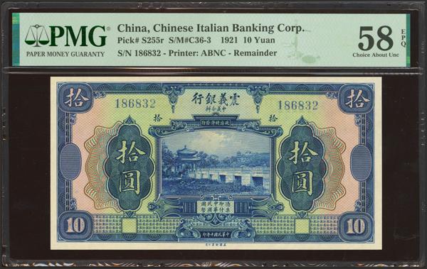 CHINA. 10 Yuan. 15 September 1921. Chinese Italian Banking Corporation. (Pick: S255, SM: C36-3). PMG58EPQ. Automatically generated translation