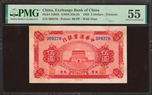 CHINA. 5 Dollars. 1 January 1920. Exchange Bank of China. (Pick: S305b, SM: C256-2b). PMG55 (pinhole). Automatically generated translation