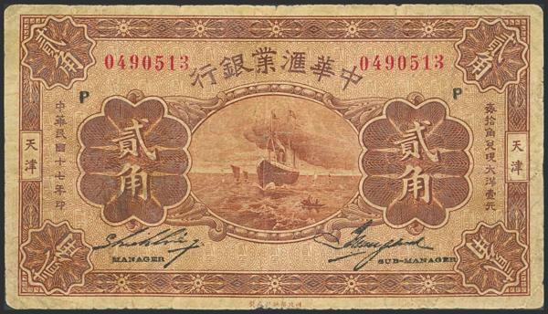 CHINA. 20 Cents. 1 May 1928. Exchange Bank of China. (Pick: S310b). Fine. Automatically generated translation