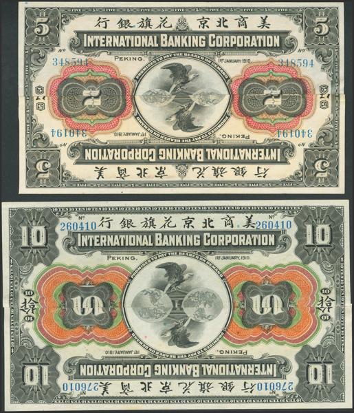 CHINA. 5 and 10 Dollars. 1 January 1910. International Banking Corporation. Beijing. Notes of this bank were canceled by cutting them in half, later two different halves were glued together to produce one note. (Pick: S413 and 414). Both halves without folds. Almost Uncirculated. Automatically generated translation