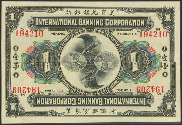 CHINA. 1 Dollar. 1 July 1919. International Banking Corporation. Beijing. (Pick: S417). Two half banknotes, both showing the upper portion, glued together at the middle. Uncirculated. Automatically generated translation