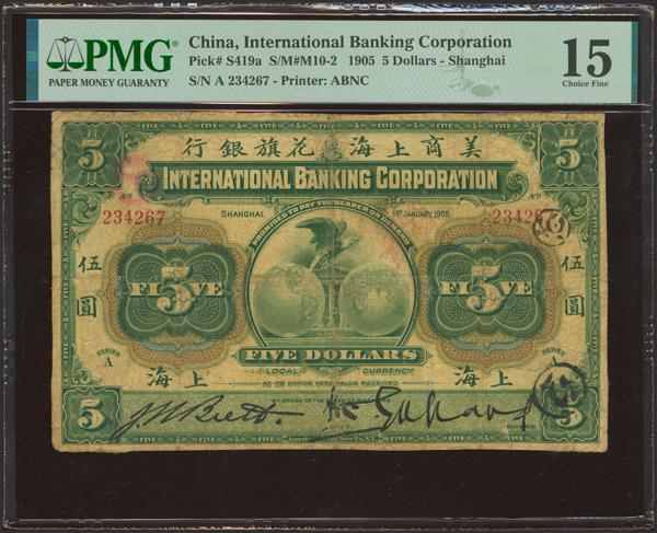 CHINA. 5 Dollars. 1 January 1905. International Banking Corporation. Shanghai. (Pick: S419a, SM: M10-2). PMG15 (repaired). Automatically generated translation