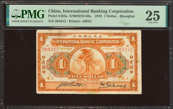 CHINA. 1 Dollar. 1 July 1919. International Banking Corporation. Shanghai. (Pick: S423a, SM: M10-50a). PMG25 (piece added, rust). Automatically generated translation