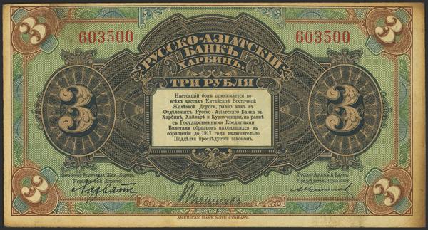 CHINA. 3 Rubles. (1917ca). Russo Asiatic Bank. Harbin. (Pick: S475a). More than Very Fine. Automatically generated translation