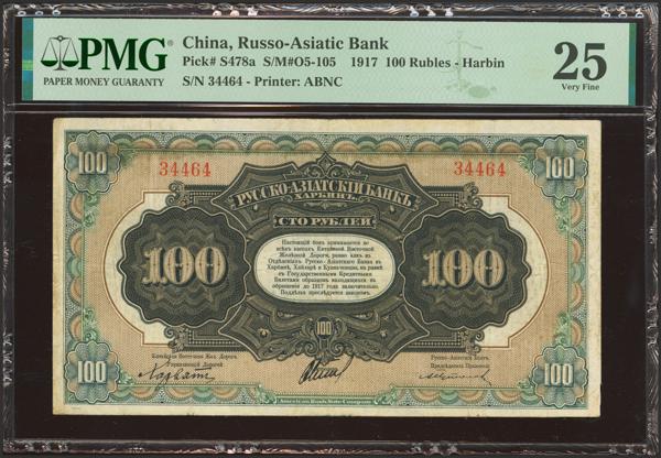 CHINA. 100 Rubles. (1917ca). Russo Asiatic Bank. Harbin. (Pick: S478a, SM: O5-105). PMG25. Automatically generated translation