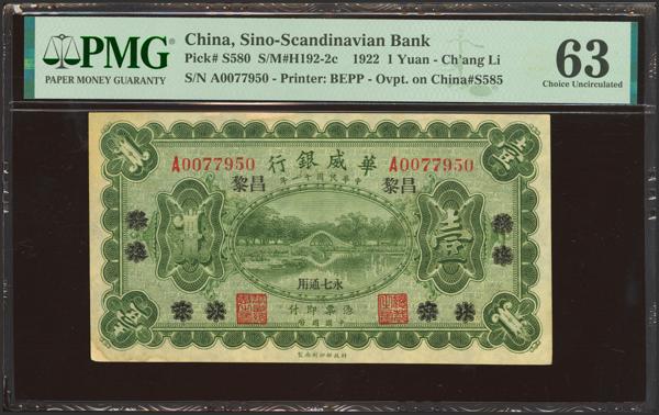 CHINA. 1 Yuan. 1 February 1922. Sino-Scandinavian Bank. Ch'ang Li. (Pick: S580, SM: H192-2c). PMG63 (lightened stains). Automatically generated translation