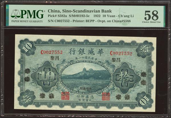 CHINA. 10 Yuan. 1 February 1922. Sino-Scandinavian Bank. Ch'ang Li. (Pick: S582a, SM: H192-5c). PMG58 (pinhole). Automatically generated translation