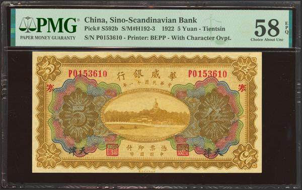 CHINA. 5 Yuan. 1 February 1922. Sino-Scandinavian Bank. Tientsin. (Pick: S592b, SM: H192-3). PMG58EPQ. Automatically generated translation