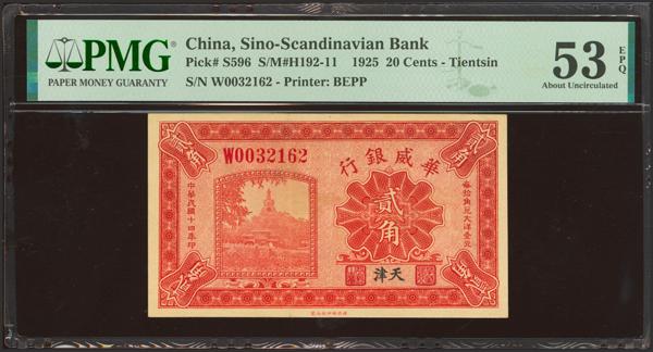 CHINA. 20 Cents. 1 October 1925. Sino-Scandinavian Bank. Tientsin. (Pick: S596, SM: H192-11). PMG53EPQ. Automatically generated translation