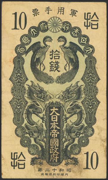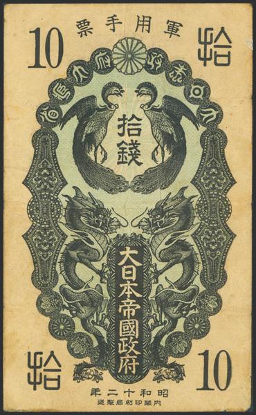 CHINA-JAPANESE MILITARY. 10 Sen. 1937. Japanese Imperial Government. (Pick: M1a). Very Fine.