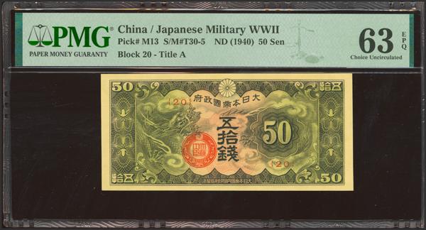 CHINA-JAPANESE MILITARY. 50 Sen. (1940ca). Japanese Imperial Government. (Pick: M13, SM: T30-5). PMG63EPQ.