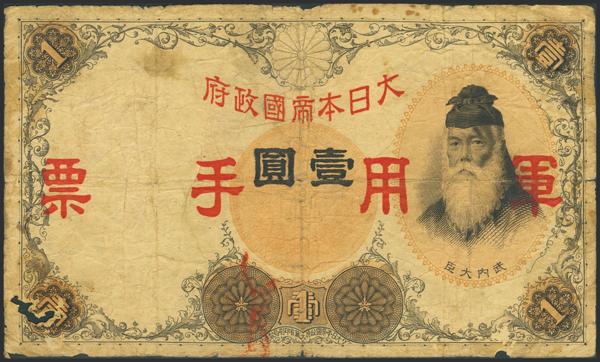 CHINA-JAPANESE MILITARY. 1 Yen. (1938ca). Japanese Imperial Government. (Pick: M23a). Wormhole, pinhole. Fine.