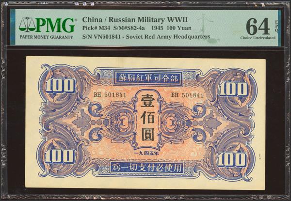 CHINA-SOVIET MILITARY. 100 Yuan. 1945. Soviet Red Army. (Pick: M34, SM: D82-4a). PMG64EPQ.