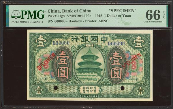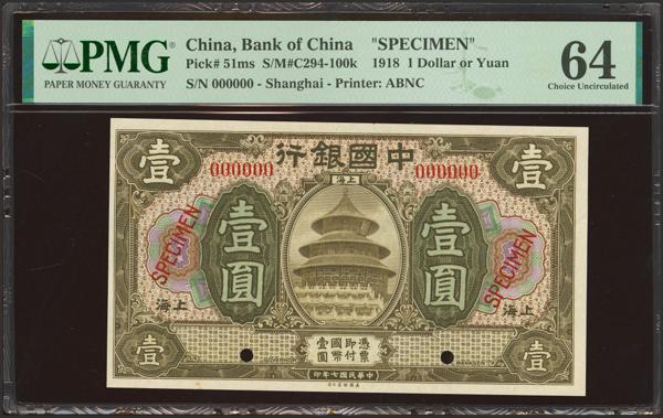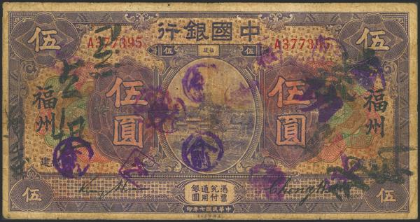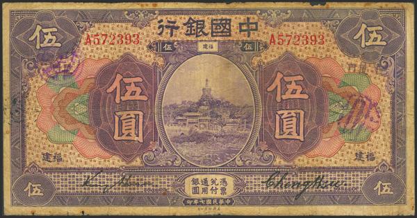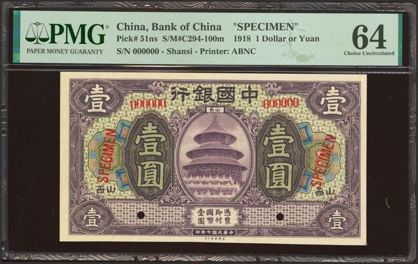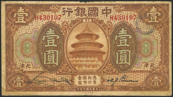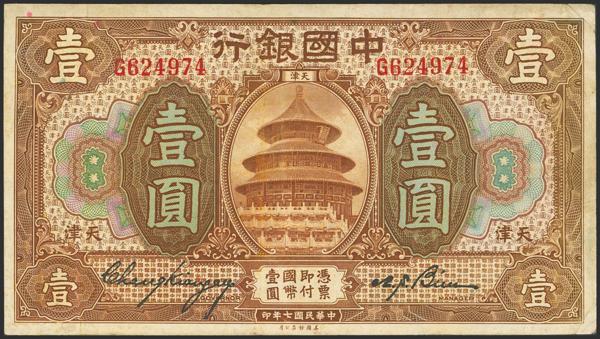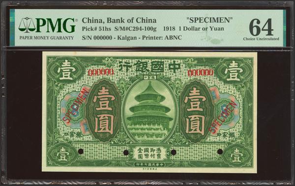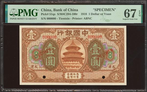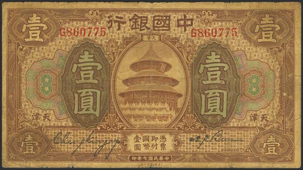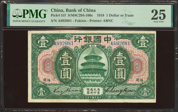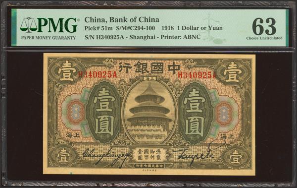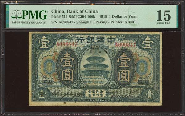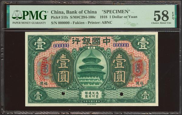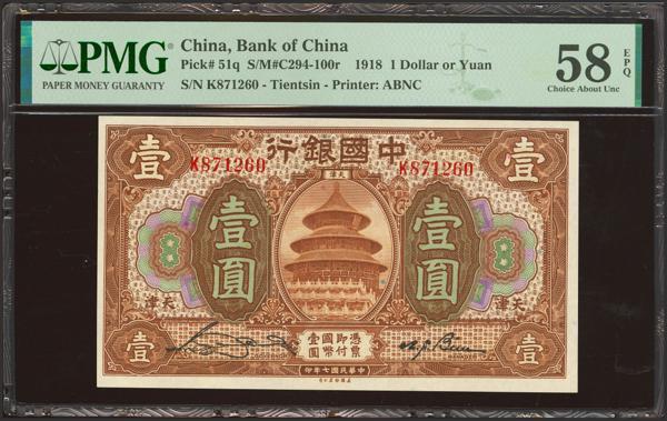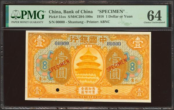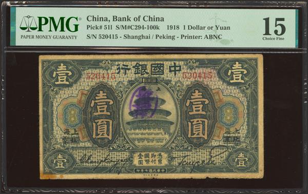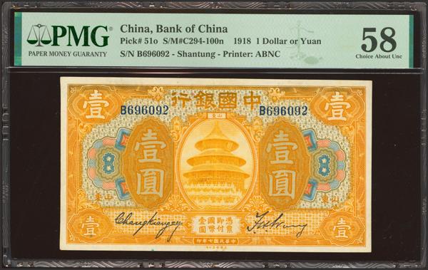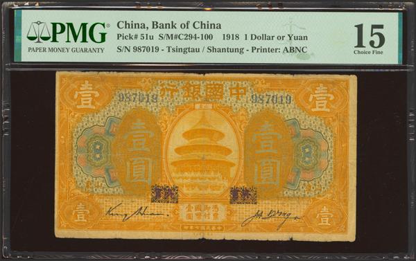 CHINA. 1 Yuan. September 1918. Bank of China. Shantung. Place of issue TSINGTAU canceled with an overprint, we are unaware of this variant and the reason for this cancellation. (Pick: 51u). PMG15 (tsingtau overprint blacked out).