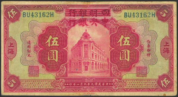 CHINA. 5 Dollars. 1 September 1920. Central Bank of China. (Pick: 170b). Fine. Automatically generated translation