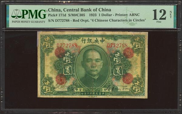 CHINA. 1 Dollar. 1923. Central Bank of China. Chinese characters overprint. (Pick: 172g, SM: C305-3). PMG15 (annotation). Automatically generated translation