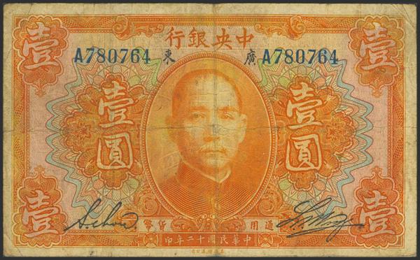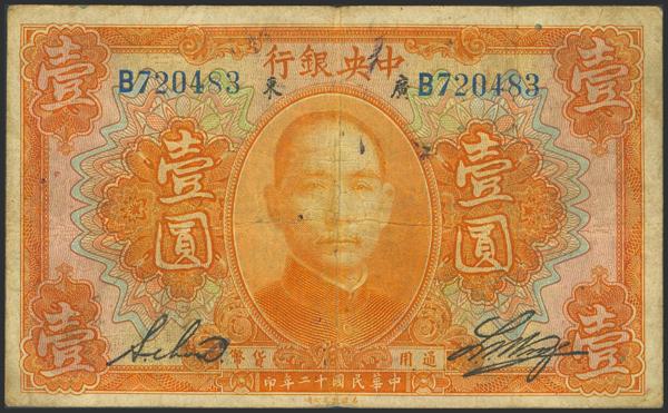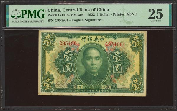 CHINA. 1 Dollar. 1923. Central Bank of China. (Pick: 172b, SM: C305-3). PMG25 (tape repair). Automatically generated translation
