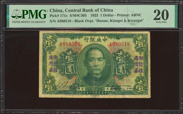 CHINA. 1 Dollar. 1923. Central Bank of China. Hunan, Kiangsi and Kwangsi. (Pick: 171c, SM: C305). PMG20. Automatically generated translation
