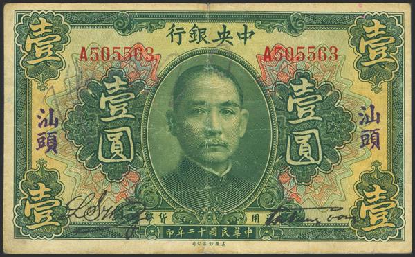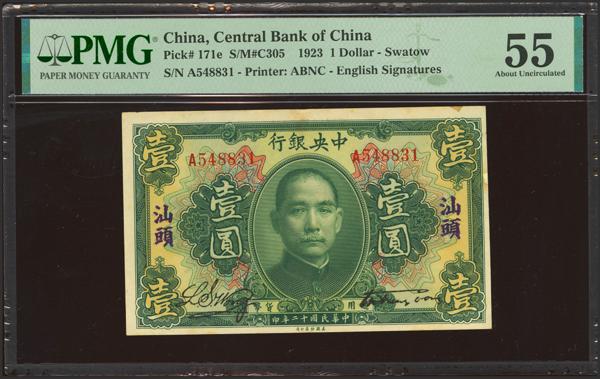 CHINA. 1 Dollar. 1923. Central Bank of China. Swatow. (Pick: 171e, SM: C305). PMG55 (repaired). Automatically generated translation