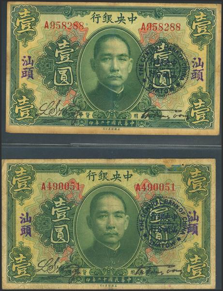 CHINA. Set of 2 notes of 1 Dollar. 1923. Central Bank of China. Swatow. Central Bank handstamp. (Pick: 171f). The A490051 note has simple restoration covering a hole and a tear. Pinhole. Fine. Automatically generated translation