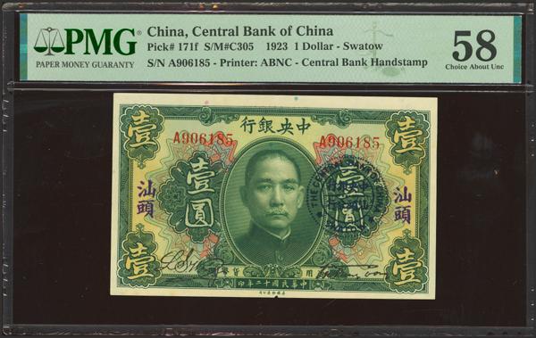 CHINA. 1 Dollar. 1923. Central Bank of China. Swatow. Central Bank handstamp. (Pick: 171f, SM: 305). PMG58. Automatically generated translation
